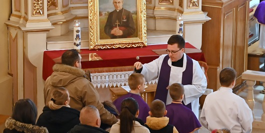 Środa Popielcowa to pierwszy dzień Wielkiego Postu. Tego dnia kapłan posypuje głowy wiernych popiołem. Tradycja posypywania głów popiołem na znak pokuty pojawiła się w VIII wieku. W XI wieku papież Urban II uczynił go obowiązującym zwyczajem w całym Kościele. Wówczas postanowiono, że popiół będzie pochodził z palm poświęconych w Niedzielę Palmową z ubiegłego roku. Obrzęd ten ma miejsce w czasie liturgii słowa po homilii i zastępuje akt pokuty. Kapłan ze złożonymi rękami zachęca najpierw wiernych, by zjednoczyli się z nim w modlitwie błagalnej o poświęcenie popiołu. Mszał Rzymski posiada dwie formuły modlitewne. W obu jest mowa o czterdziestodniowym okresie pokuty i błaganiu o oczyszczenie z grzechów, które mają przygotować na uczestnictwo w Misterium Paschalnym Chrystusa. Następnie następuje właściwy obrzęd posypania. Wierni zbierają się przy stopniu komunijnym, a kapłan posypując ich głowy mówi: Nawracajcie się i wierzcie w Ewangelię lub Pamiętaj, że jesteś prochem i w proch się obrócisz. W dniu dzisiejszym również i w naszym kościele zgromadziło się wielu parafian, którzy chcieli rozpocząć przygotowania do zrozumienia tajemnicy Paschalnej poprzez posypanie głów popiołem oraz rozpocząć praktykowanie różnych form abstynencji i pokuty, np. zaniechanie lub ograniczenie palenia papierosów, oglądania telewizji, picia napojów alkoholowych, a także korzystania z sieci społecznościowych itd. Niech tegoroczny Wielki Post będzie czasem duchowej przemiany i odnowy.